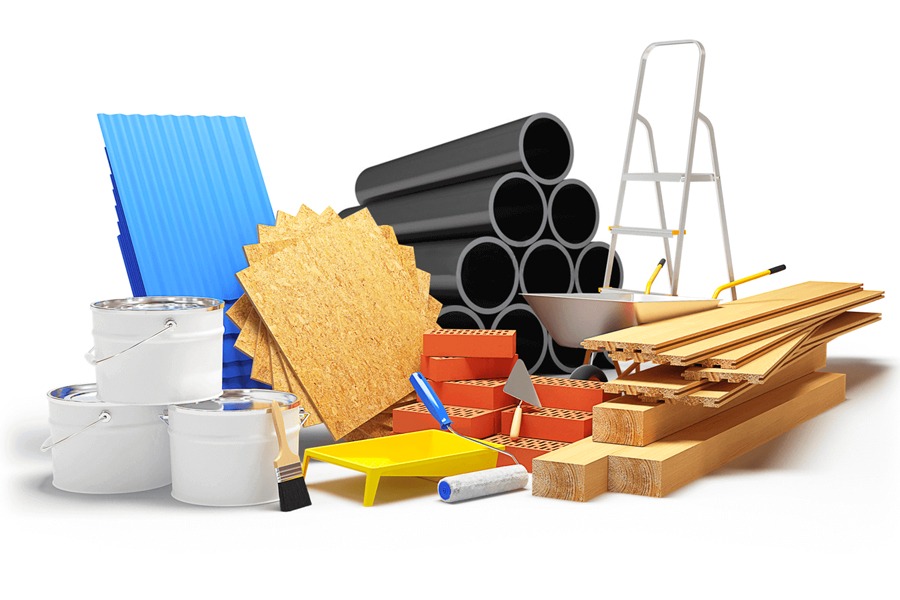 Aggregates, Plumbing, Sand, Bricks, Metals and Reinforcement, Cement and all finishing building materials, like gypsum body, roofing plate, paint etc